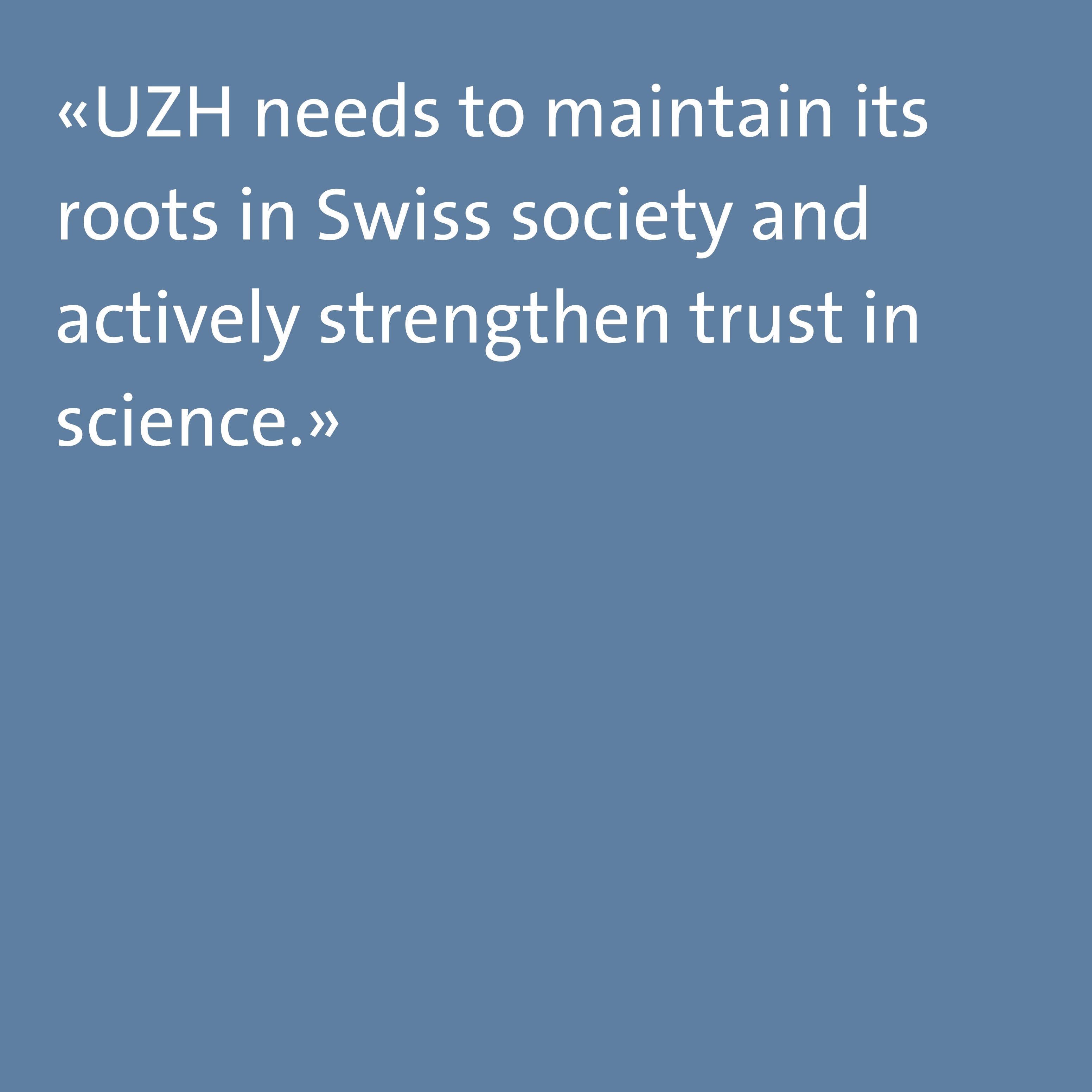 I’m currently concerned with the situation in the US, which reveals a significant divide between society and the scientific community. In order to counter such a development, UZH needs to maintain its roots in Swiss society and actively strengthen trust in science.